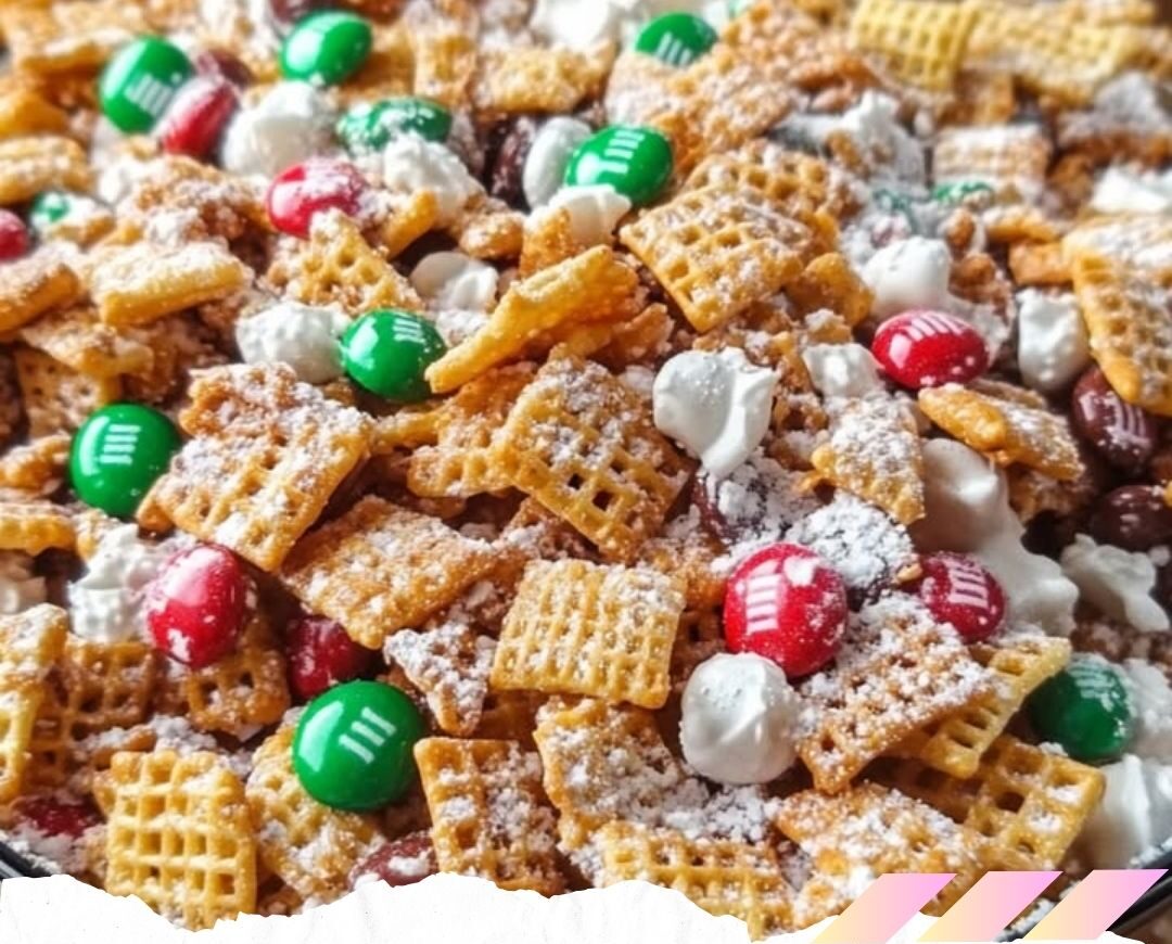 4. **Add sugar and sprinkles:** Sprinkle the powdered sugar over the mix, tossing gently to coat. Add red and green sprinkles for a festive touch.