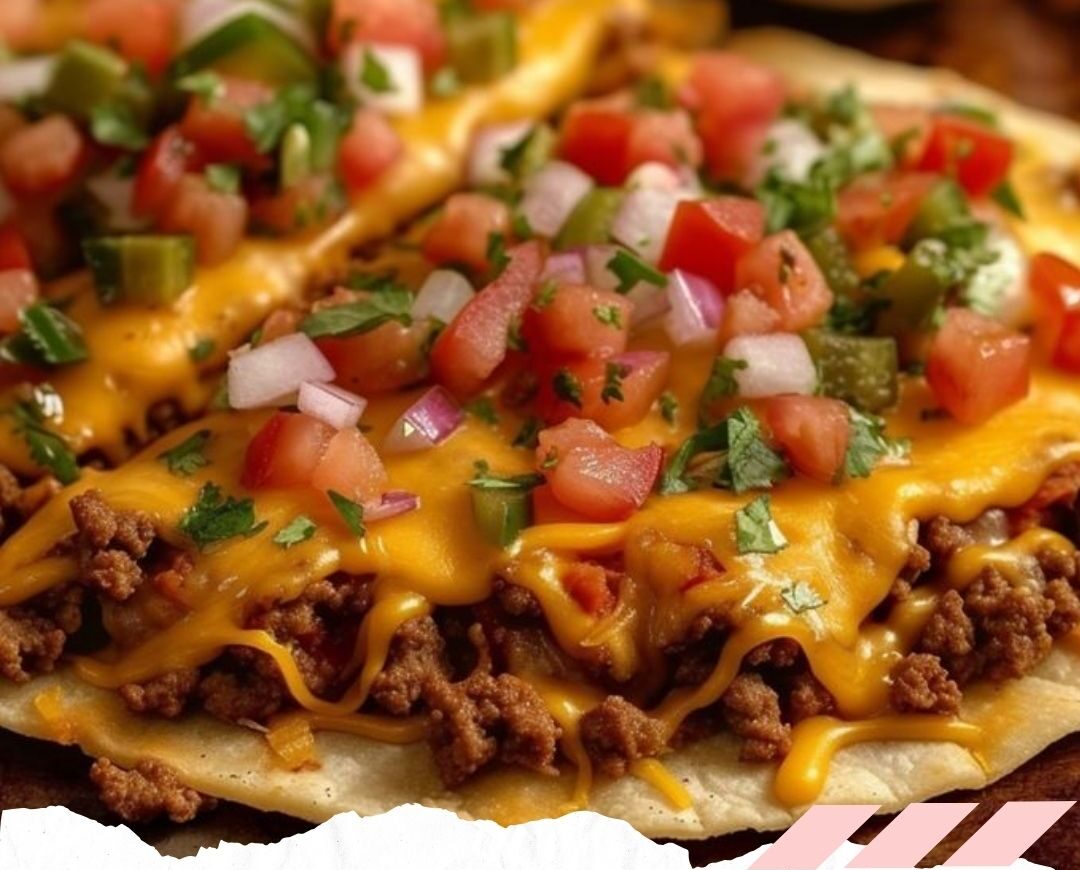 3. Place 6 of the flour tortillas onto baking sheets. Spread a thin layer of enchilada sauce over each one. Spread refried beans evenly over each tortilla. Top with the ground beef mixture and sprinkle with cheese. Place remaining tortillas over the cheese.