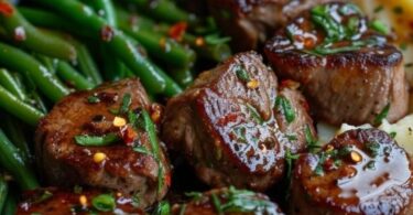 Garlic Butter Steak Bites with Mashed Potatoes and Green Beans
