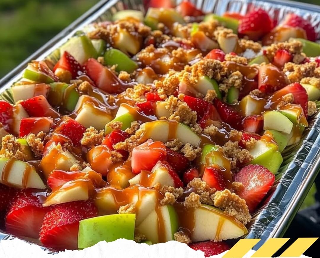 In a large serving dish or tray, layer the strawberries, green apples, and red apples.