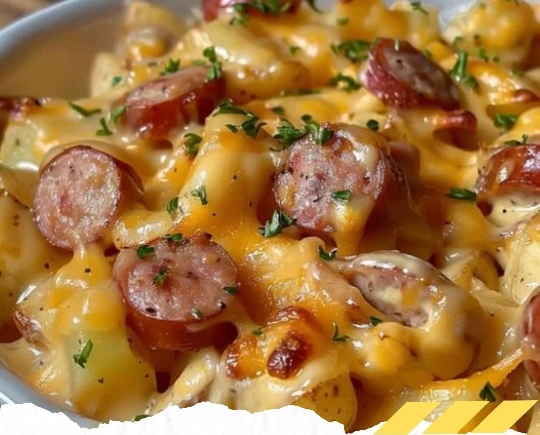 - Sauté 1 lb sliced smoked sausage, 2 sliced bell peppers, and 1 diced onion in a hot pan.