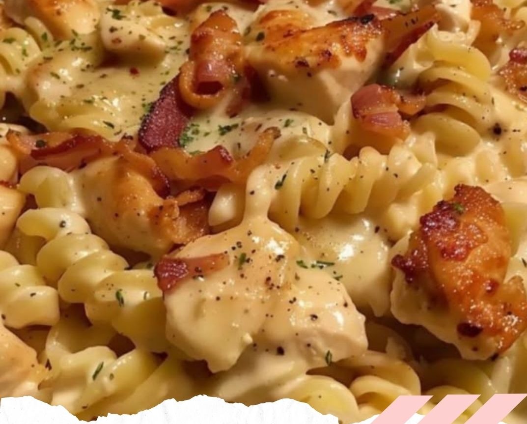 Combine: Add pasta to the sauce, then chicken, and garnish with bacon. Serve warm.