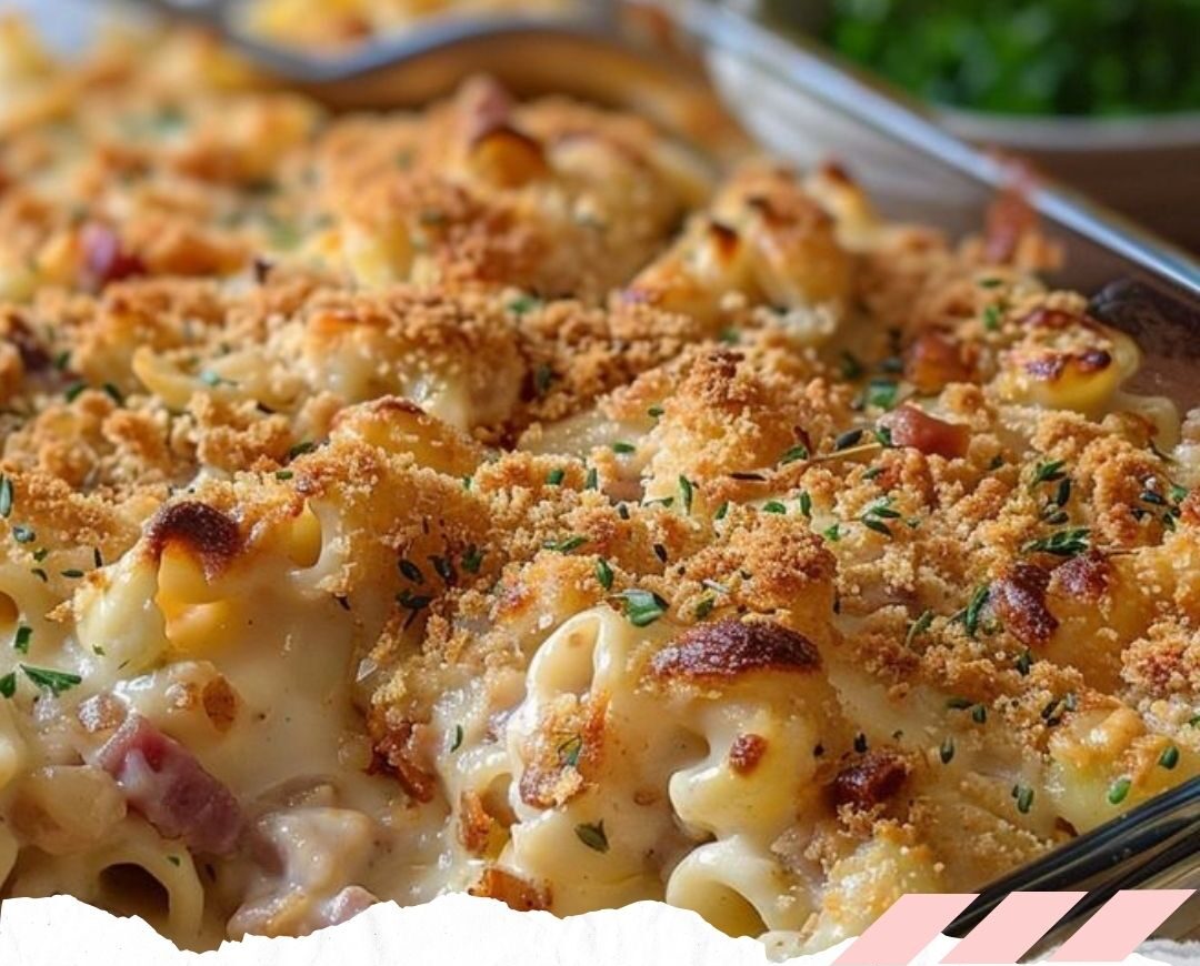 - In a large bowl, combine the cooked chicken, diced ham, and cooked pasta. Spread this mixture evenly in the prepared baking dish.