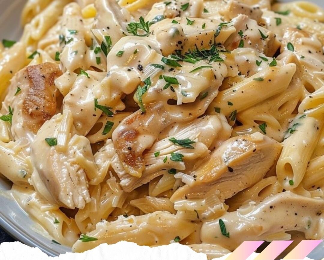 5. Stir in Parmesan cheese until melted and smooth. Return cooked chicken to the skillet, adding cooked pasta as well. Toss everything together until the pasta is coated in the creamy sauce.