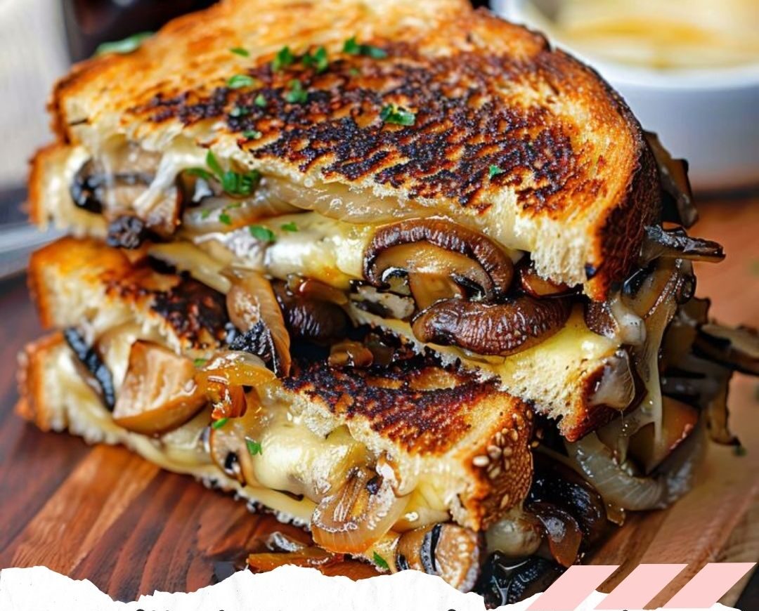 - While the butter is melting, assemble the sandwiches. On one slice of bread, layer shredded gouda, the roasted mushrooms and onions, then more gouda. (Layering this way ensures that the melty cheese will hold the sandwich together.) Salt and pepper to taste. Top with the other slice of bread. Lightly press together.