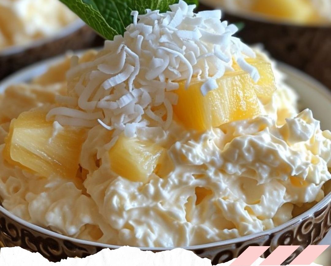 2. Next, add the sweetened shredded coconut, mini marshmallows, and drained pineapple tidbits to the bowl. Gently fold these ingredients into the pineapple pudding mixture until evenly distributed, ensuring every bite is packed with tropical goodness.