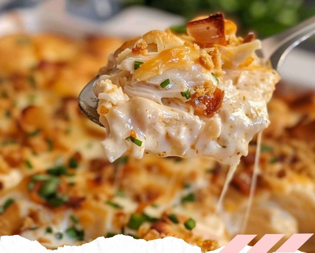 - In a separate bowl, mix the crushed Ritz crackers with melted butter. Sprinkle evenly over the chicken mixture.