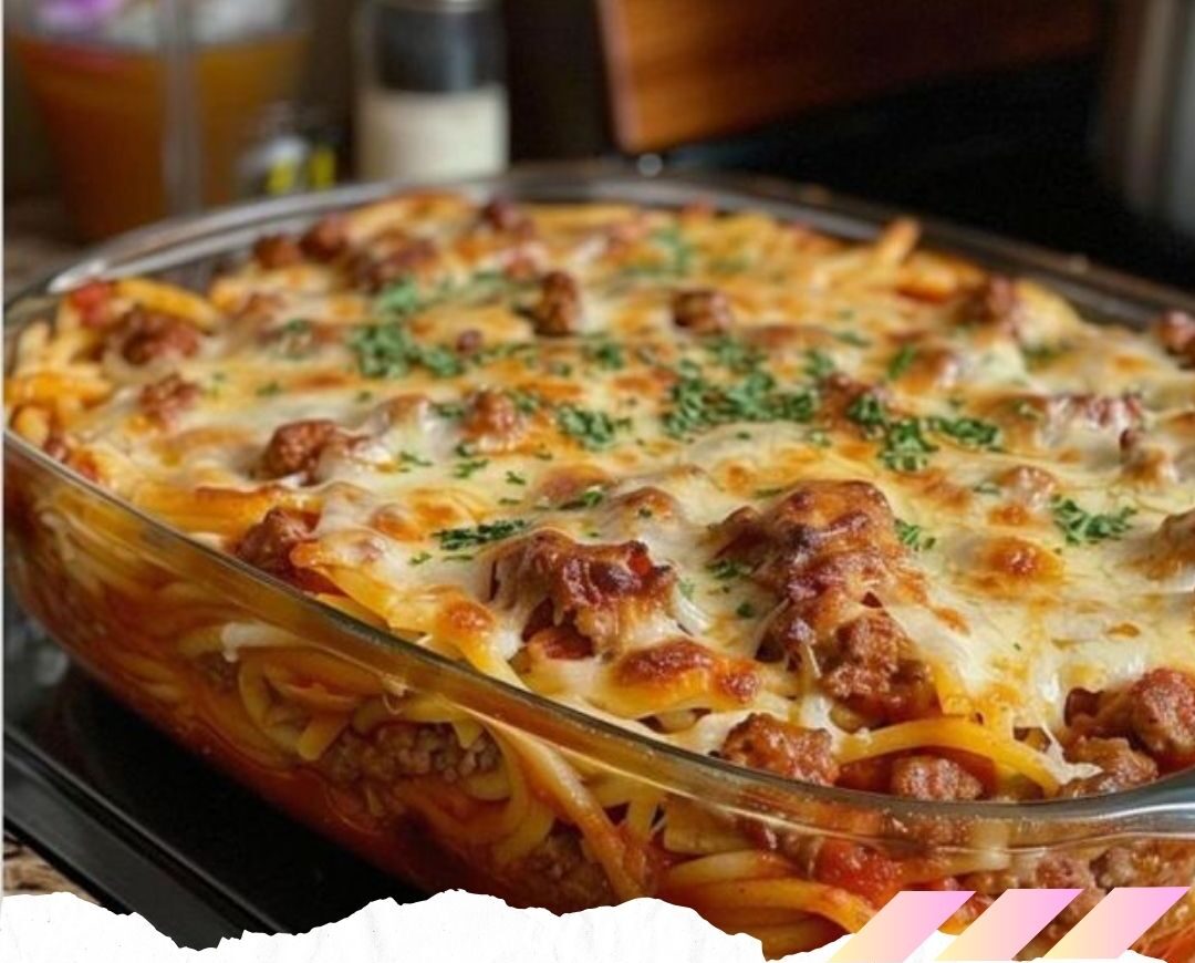 6. Pour ground beef mixture over spaghetti and spread in an even layer.