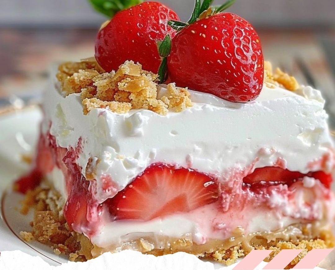 Once the strawberry layer is set, top the lasagna with additional whipped topping. Garnish with fresh strawberries on top before serving.