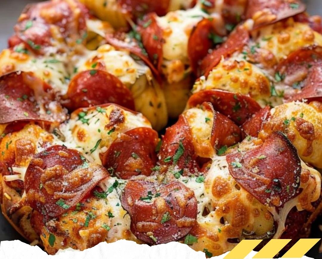 - In a large bowl, combine the biscuit pieces, sliced pepperoni, mozzarella cheese, parmesan cheese, Italian seasoning, melted butter, garlic powder, and garlic salt. Toss until well combined.