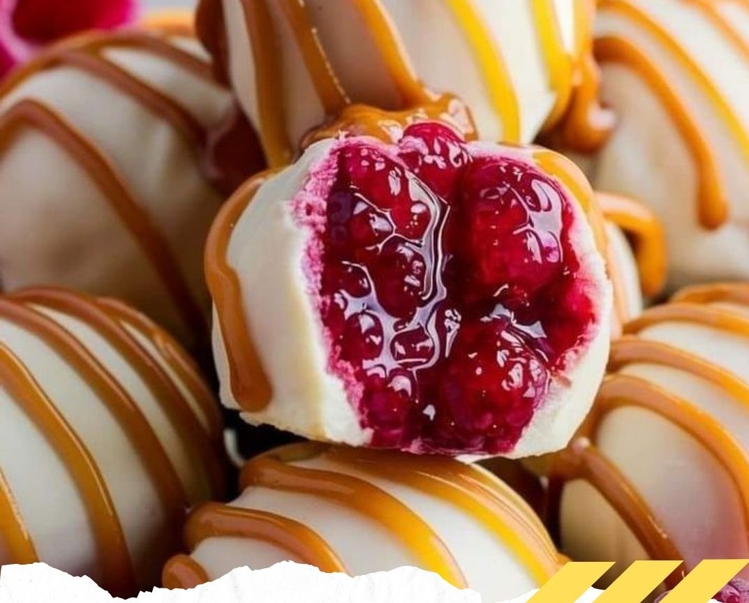Warm the raspberry preserves slightly and strain to remove the seeds. Let cool. Melt the dark chocolate and heavy cream in a heat-proof bowl over a pot of simmering water, stirring until smooth. Remove from heat and stir in the raspberry preserves. Chill in the refrigerator until firm, about 1 hour. Once chilled, scoop out teaspoon-sized amounts of the mixture and roll into balls. Place on a baking sheet lined with parchment paper and freeze for 30 minutes. Melt the white chocolate and shortening together in the microwave in 20-second bursts, stirring until smooth. Using a fork, dip each frozen truffle into the melted white chocolate to coat completely, letting the excess chocolate drip off. Return to the parchment paper. Drizzle with caramel sauce and dust with freeze-dried raspberry powder. Chill until set.