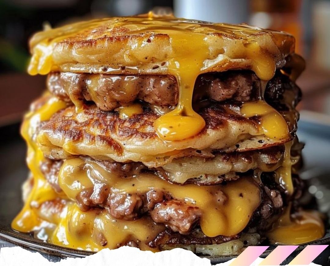 - Assemble the smash burger pancakes by layering a pancake, a cheesy beef patty, some burger sauce, sliced gherkins, and then another pancake. Repeat for the second burger.