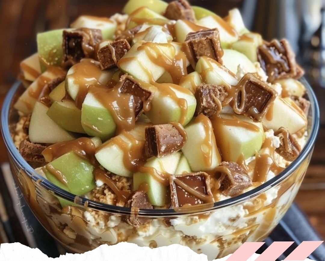 - Add the Granny Smith apples and Snickers bars and gently mix them in the pudding mix.