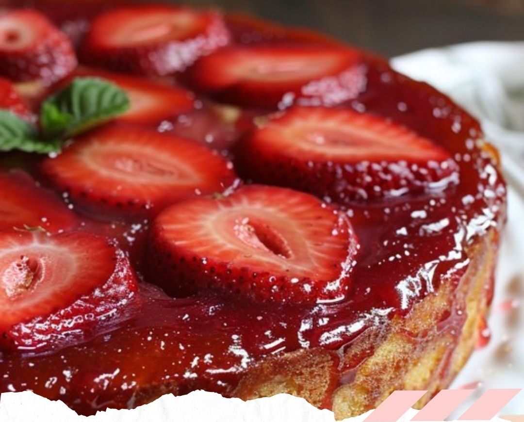 - Pour the batter over the strawberries in the cake pan and spread it evenly.