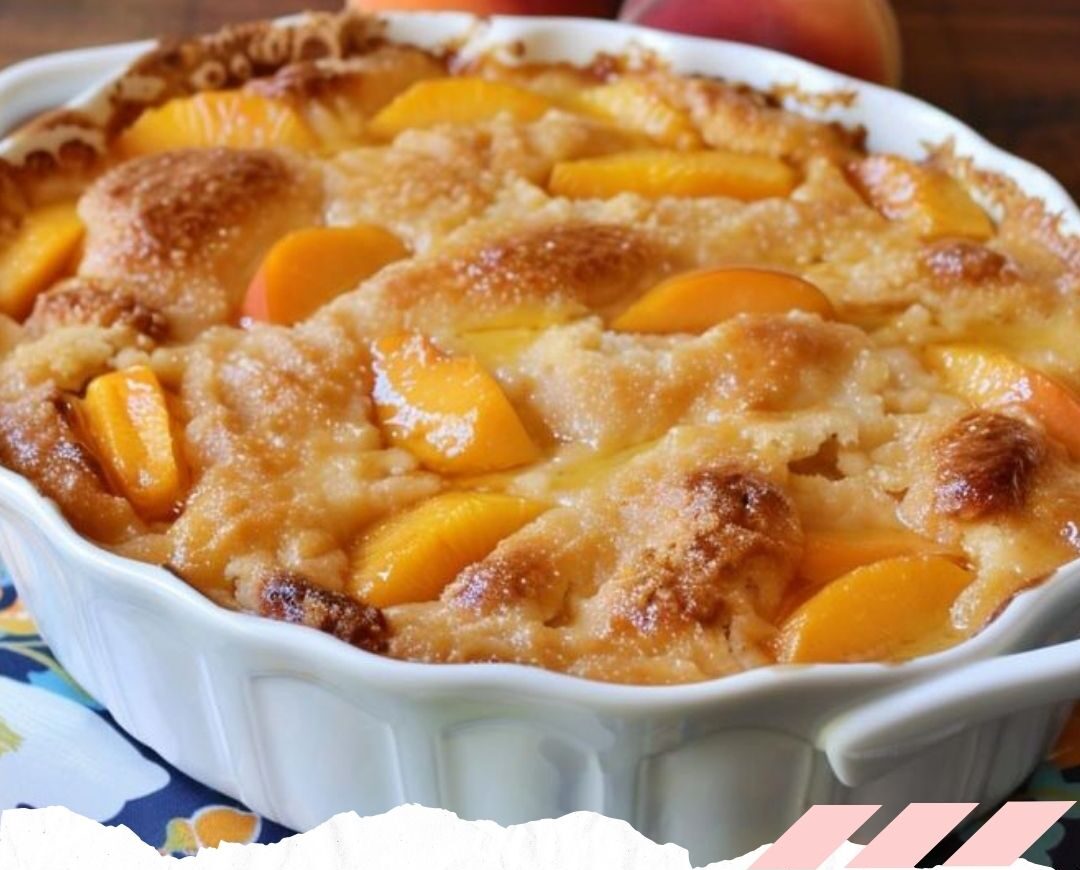 2. In a mixing bowl, toss the sliced peaches with 1/2 cup of sugar. Spread the sugared peaches evenly in the bottom of the prepared baking dish.